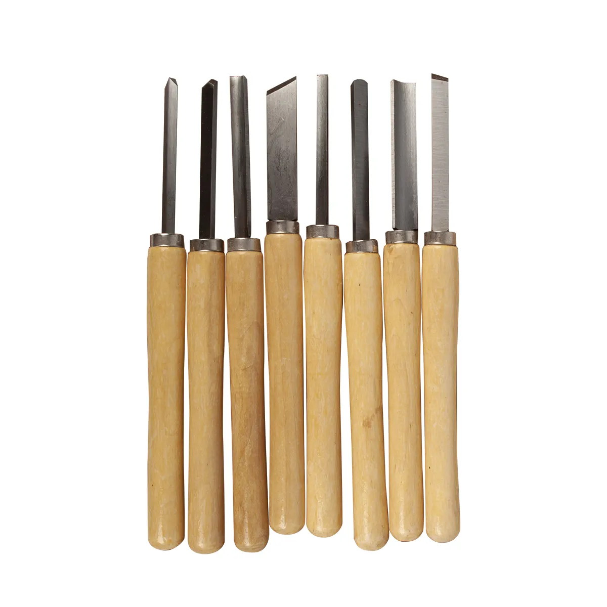 - Set contains: 1in Roughing gouge | 7/8in Roughing gouge | 5/16in Spindel gouge | 1in Skew chisel | 5/8in Skew chisel | 5/8in Spear scraper | 5/8in Round nose scraper | 5/8in Parting tool.