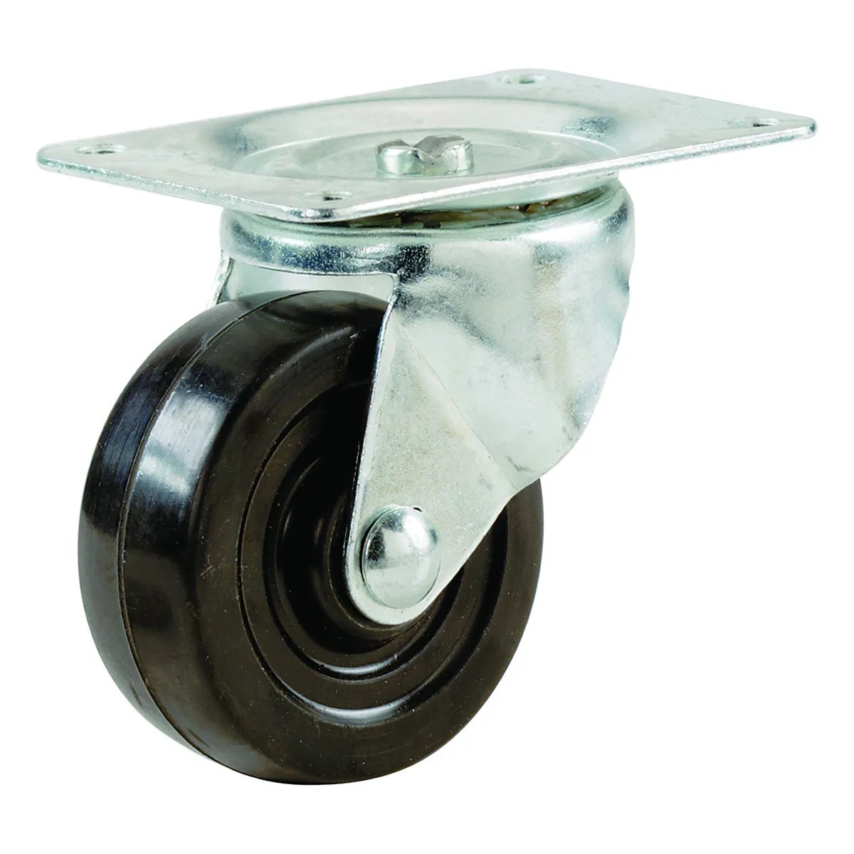 - 1-1/2 in diameter black soft rubber wheel with ball bearing swivel and plate mount.