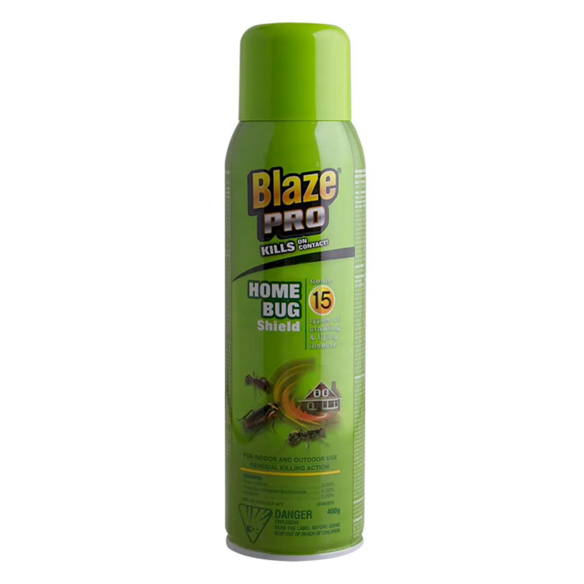Blaze Pro home bug shield for outdoor/indoor use. Home bug shield treats different crawling and flying insects including spider; earwigs; cockroaches; crickets; millipedes; silverfish; ants; fleas; carpet beetles and brown dog ticks.