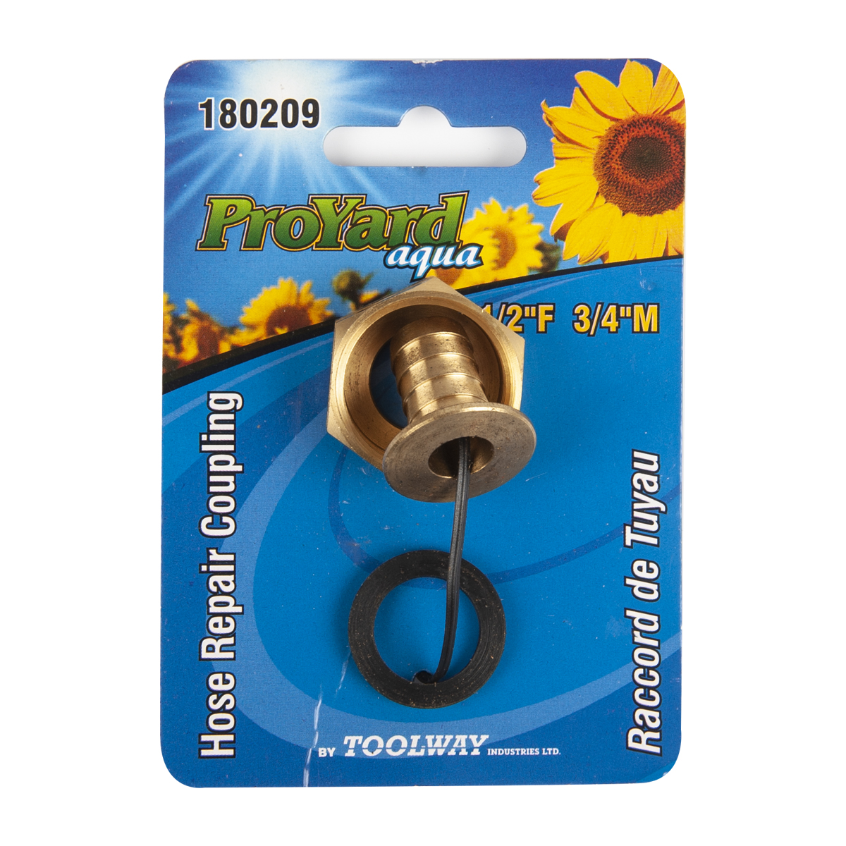 Brass Hose Coupling 1/2in Female 3/4in Male Adapter for connecting a hose to a male threaded connection of a different diameter Hose barb on one end and Female threads on the other Brass for corrosion resistance.