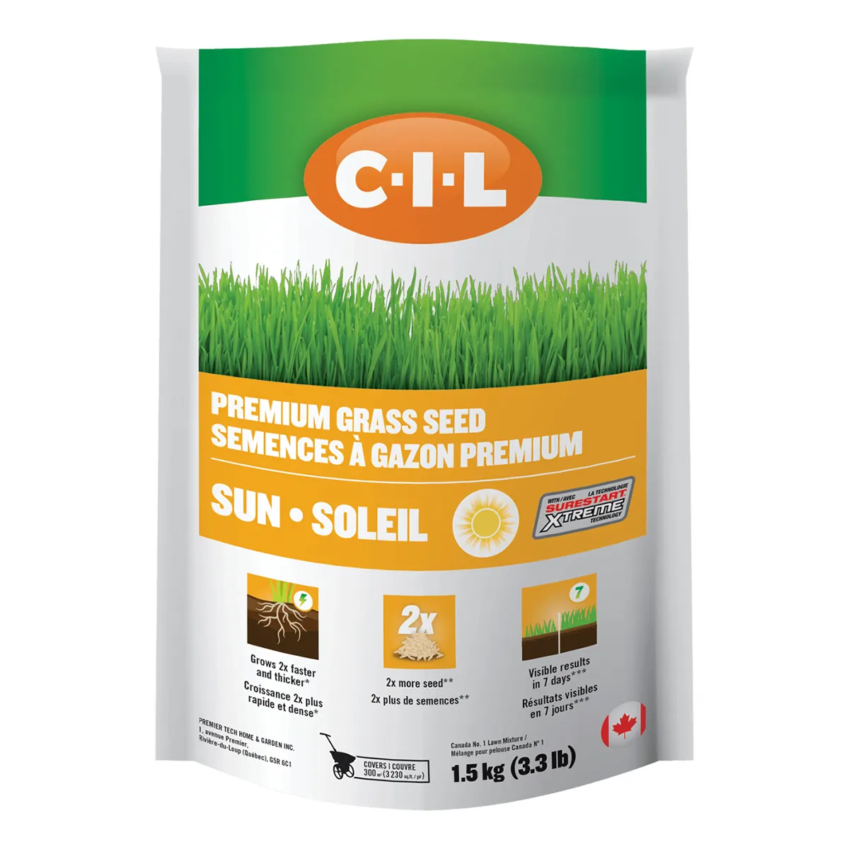 Visible results in 7 days C-I-L® Premium sun grass seed with SURESTART® XTREME is perfect for seeding new lawns; overseeding or bald spots in sunny areas. It grows 2 times faster and thicker with 2 times more seed. Visible results in 7 days.