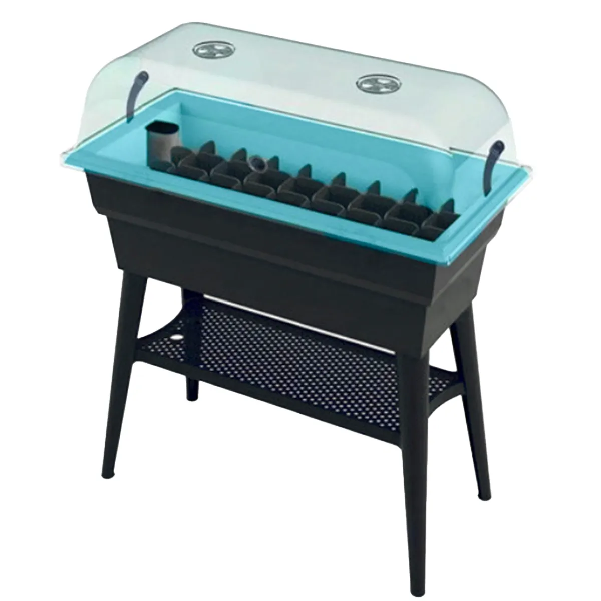 Included are the 10. 5 gallon mini greenhouse/window box; dual-wall containers; removable legs; seed partitions and water level control.