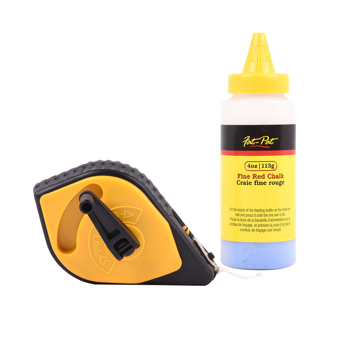 The 100ft Chalk line reel kit includes the chalk reel and a 4oz bottle of fine red chalk. Put the nozzle of the feeding bottle on the chalk line reel and press it until the line reel is full.