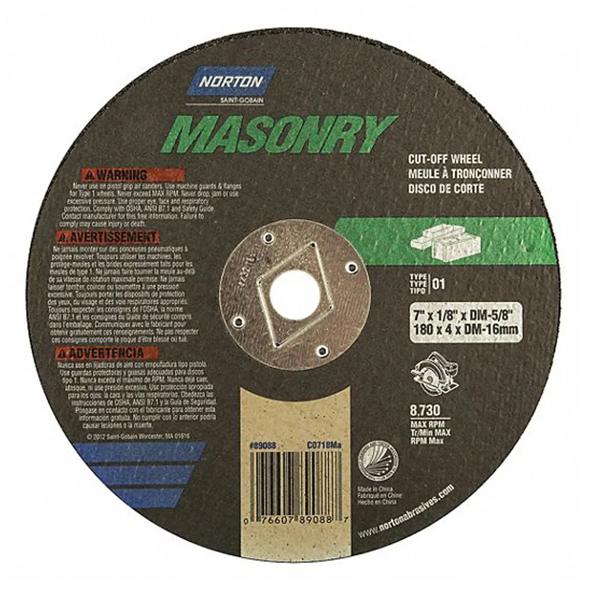 Full fiberglass reinforcement construction gives this wheel a long life while cutting through a variety of masonry materials such as brick, concrete and asphalt.
