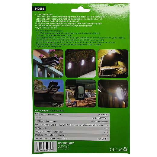 - Multi-purpose use camp light; security light; table light; emergency light.