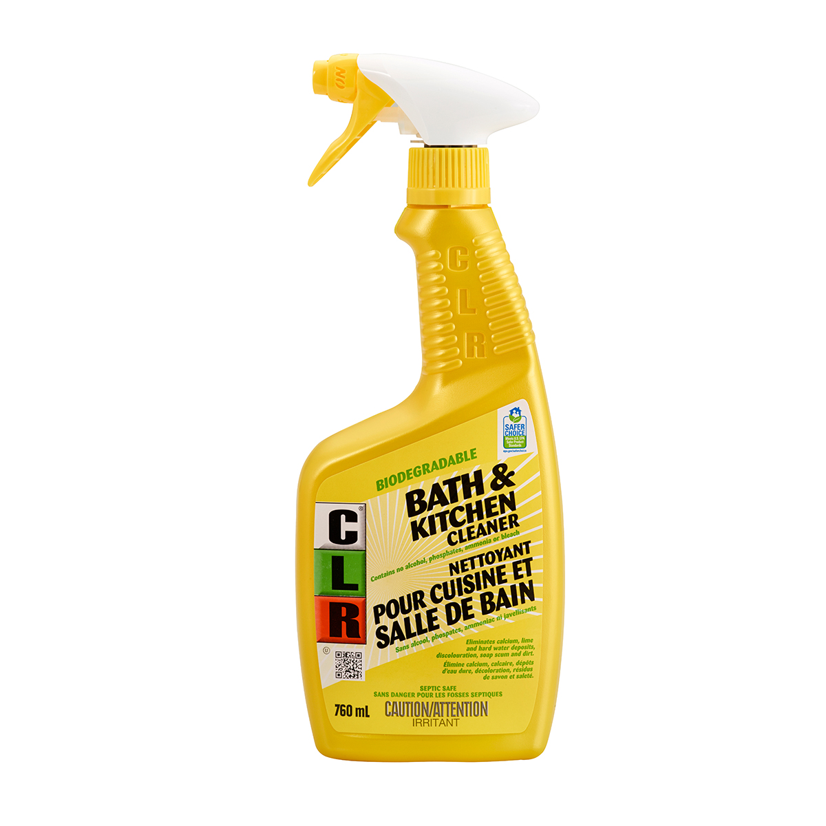 CLR bath and kitchen cleaner removes hard water buildup; calcium deposits; lime; and dirt from kitchen and bathroom surfaces without scrubbing or using several different products. This versatile; multi-surface cleaner foams to remove even the toughest buildup from sinks; faucets; showerheads; and bathtub surrounds. Made in the USA with quality ingredients; it is certified by the environmental protection agency (EPA's) design for environment. CLR is easy to use and cleans in just two steps; effectively removing stains while saving time. Just spray the solution onto the sink; shower door; or faucet; and wipe clean. CLR cleans the two dirtiest rooms in your home with less effort.
