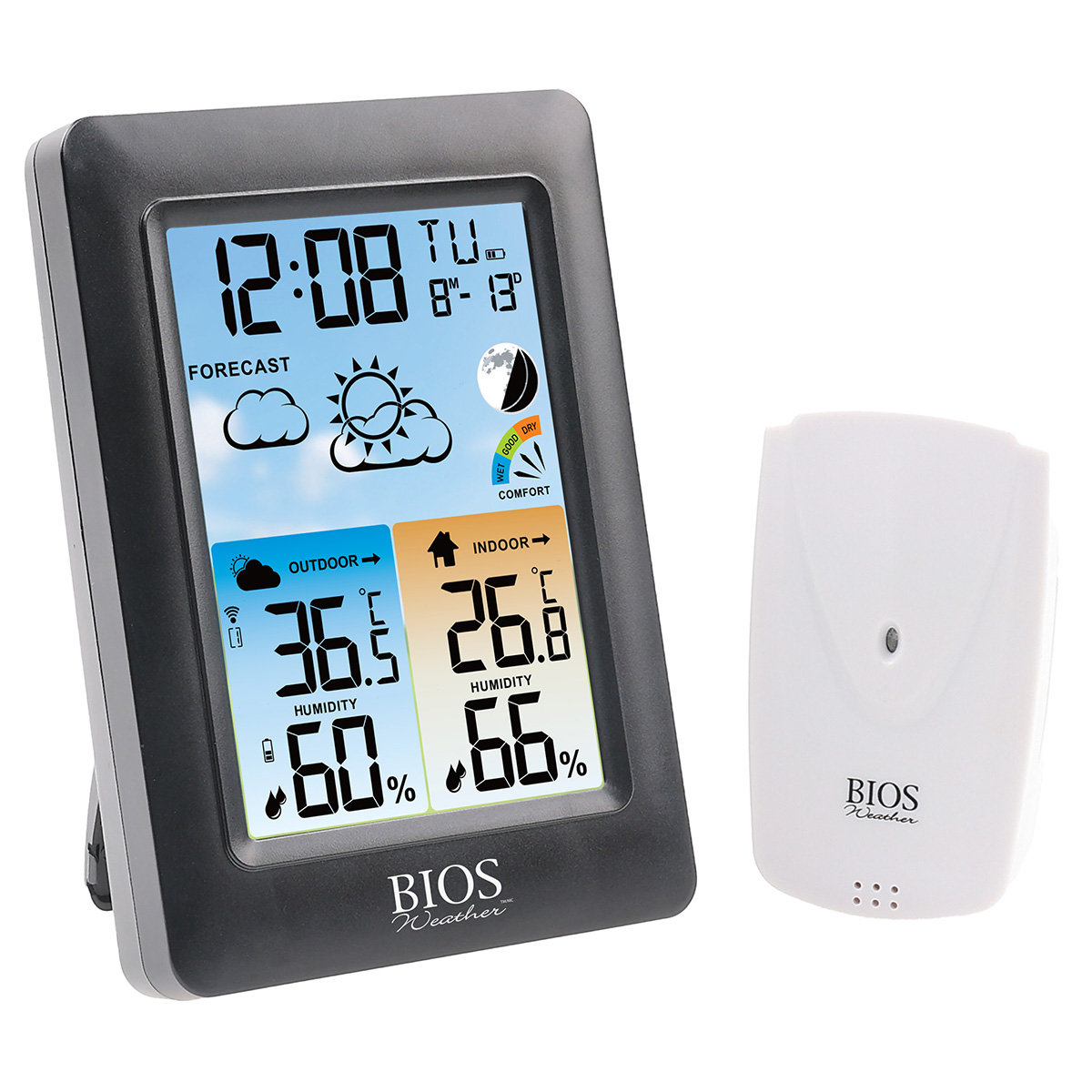 Keep track of indoor and outdoor conditions with this wireless thermometer; designed for modern home use. It features a clear display with comfort level indicators; moon phase tracking; and weekday display in 7 languages to suit your preference. With 3-channel capability; you can connect up to three sensors to monitor different outdoor locations simultaneously. Enjoy a strong wireless transmission range of up to 50 meters (164.5 feet) for reliable data updates. The main station is powered via the included Type-C USB cord; with optional battery backup for added convenience. Power Requirements: Station – 2 x AAA (not included) | Sensor – 2 x AAA each (not included).