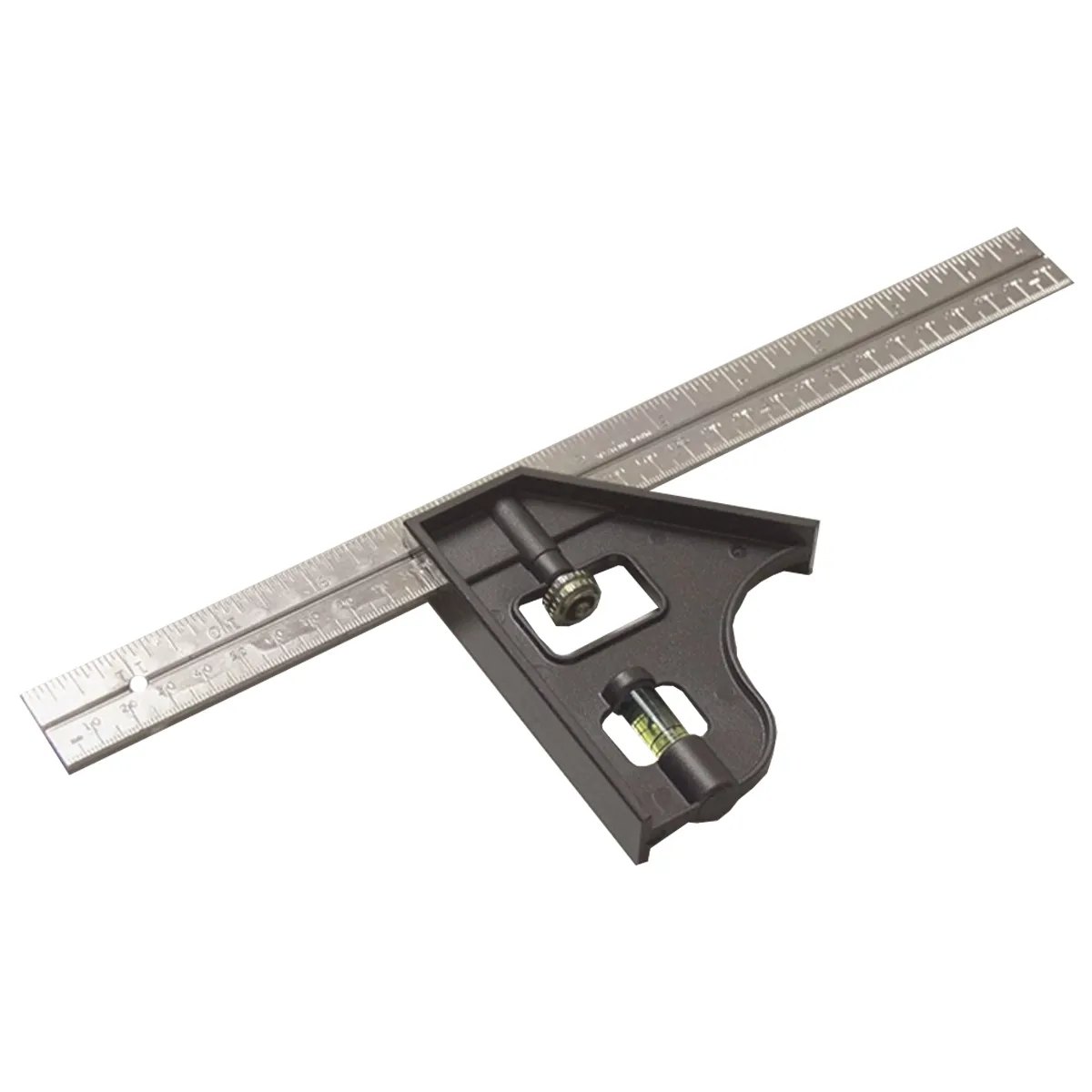 12in Combination Square is Ideal for level; plumb; and miter work. Level vial in the head of the square. Easy to read permanently etched graduations. Square has steel scribe and solid brass knurled thumb screw for adjustment.