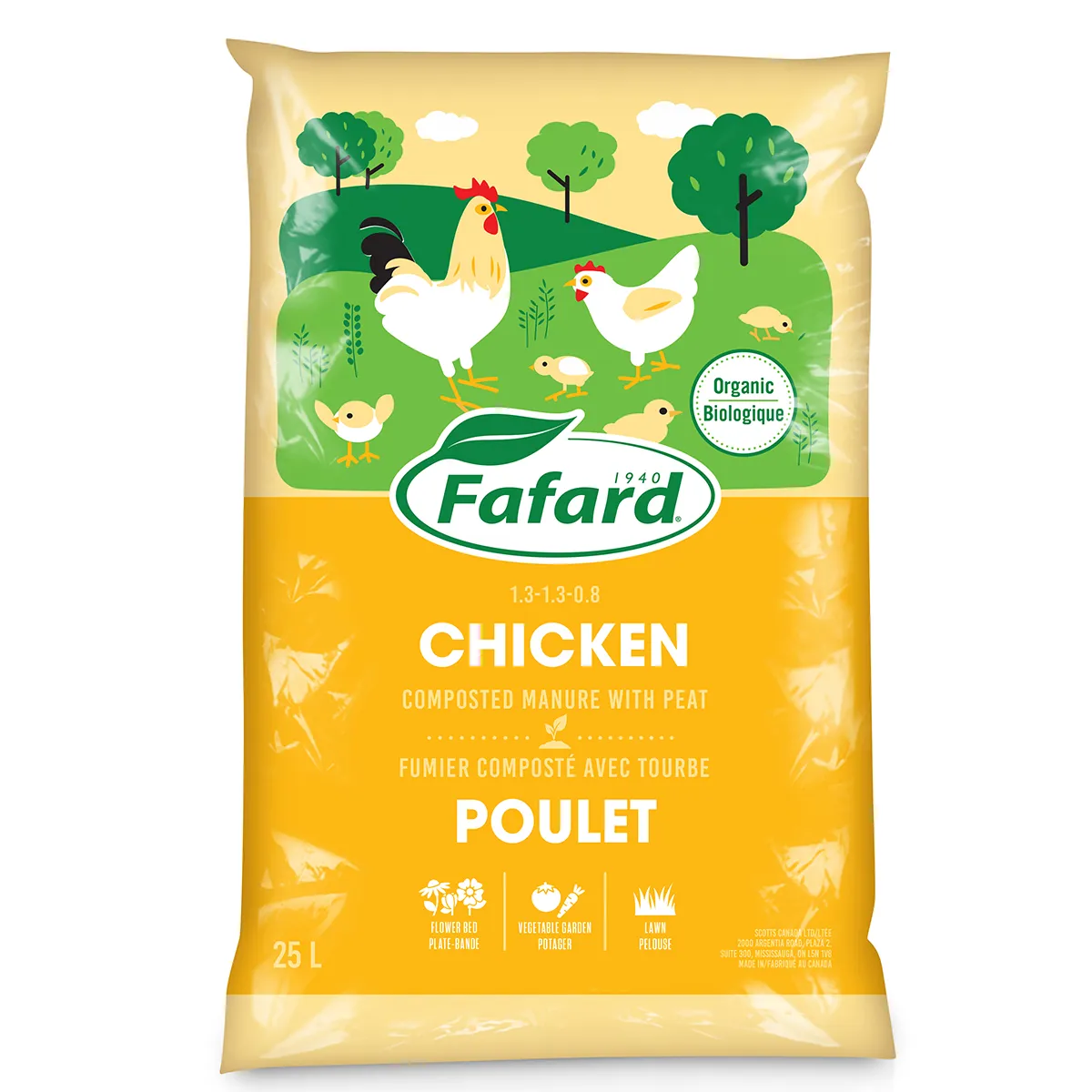 Approved for organic gardening; the Chicken Composted Manure with Peat is specially designed for maintaining lawn; vegetable gardens and flower beds. This amendment improves soil structure and fertility while providing essential nutrients for healthy and vigorous growth.