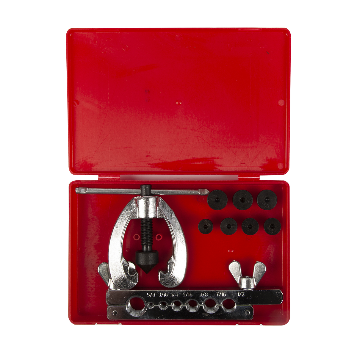 - Heavy duty flaring tool kit; designed to double or single flare in copper; aluminum; brass; magnesium and soft steel brake line tubing.