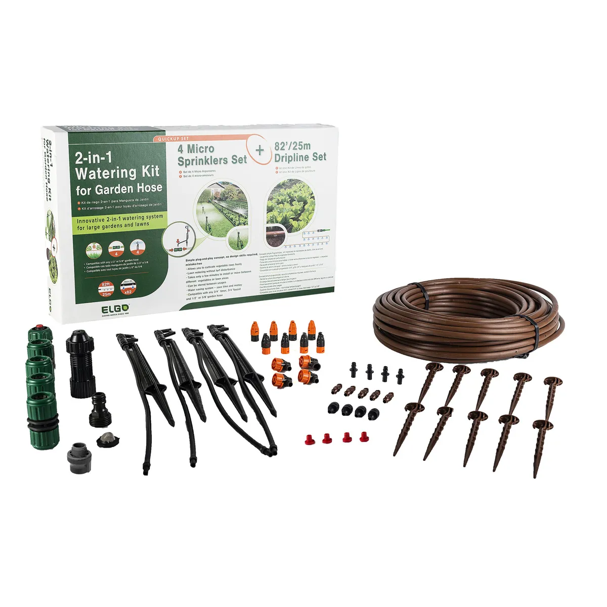 Conserve water while keeping your plants happy and hydrated with the Elgo 2-in-1 watering kit for your garden hose. This customizable system features both sprinkler and dripline capabilities with water saving technology. With pre-assembled components; the 2-in-1 adapts and works with your existing garden hose; making it an easy install. Each kit includes four micro sprinklers with interchangeable nozzles for half/full circle watering; four quick-up connectors and an 82 ft roll of eight-millimeter drip line.
