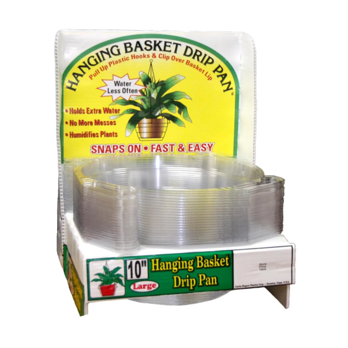 The Curtis Wagner Hanging Basket Drip Pan; fast easy clips on hanging basket; catches water flow; keeps plant moist; has molded built-in hooks; for indoor and outdoor use. Made in USA.