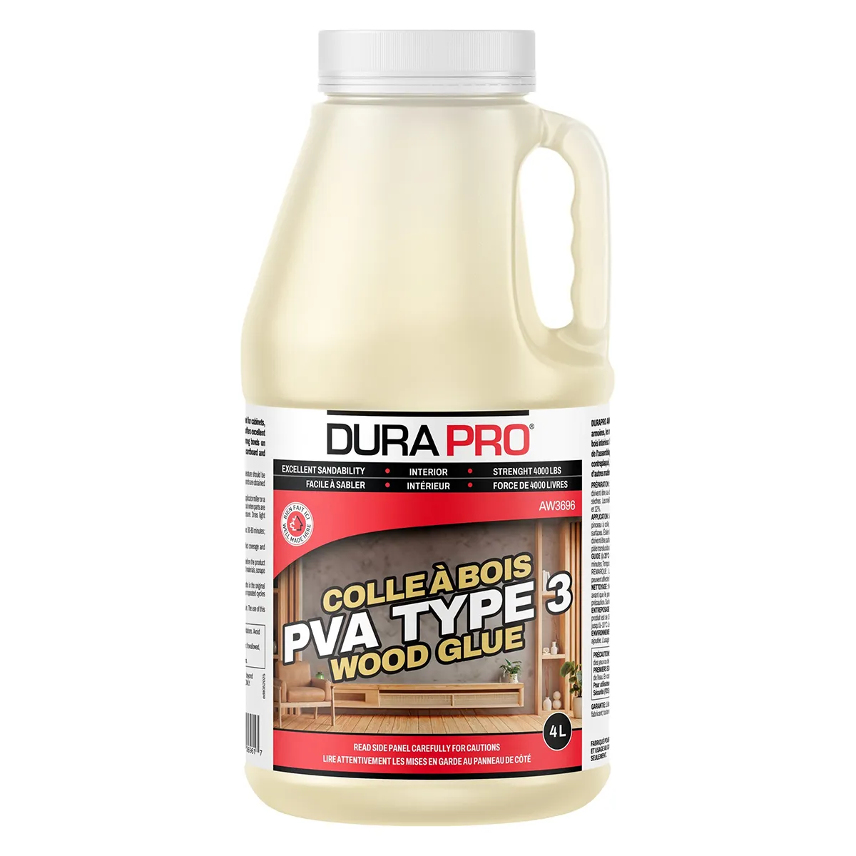 DURAPRO AW3696 is a polyvinyl acetate based adhesive designed for cabinets; furniture; carpentry work and other indoor wood gluing projects. It has an excellent initial grip and reduced slip during assembly. Forms strong bonds on hardwood; softwood; plywood; natural wood composites; MDF; cardboard and other porous materials.