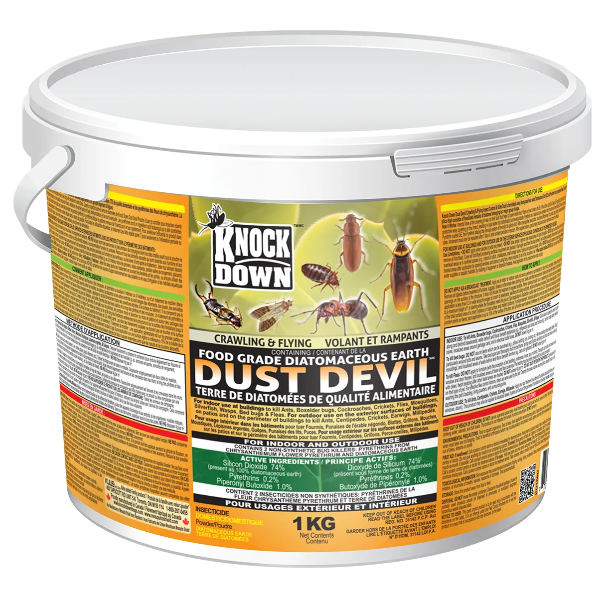Knock Down Dust Devil Crawling & Flying Insect Control & Killer Dust is formulated using food-grade fresh water Diatomaceous Earth (DE) and Pyrethrins from chrysanthemum flowers. DE is a form of amorphous silica that consists of fossilized remains of diatoms belonging to a major group of algae. How it Works: Insects have a thin covering of wax on their body that helps to prevent water loss. When an insect contacts Knock Down Diatomaceous Earth; the DE damages the protective waxy covering on the insect; resulting in rapid water loss (dehydration) and eventual death. Pyrethins are a botanical active ingredient which have been combined with the DE. When an insect comes in contact with the Pyrethin coated DE; the Pyrethin attacks the nervous system of the insect to quickly kill it.