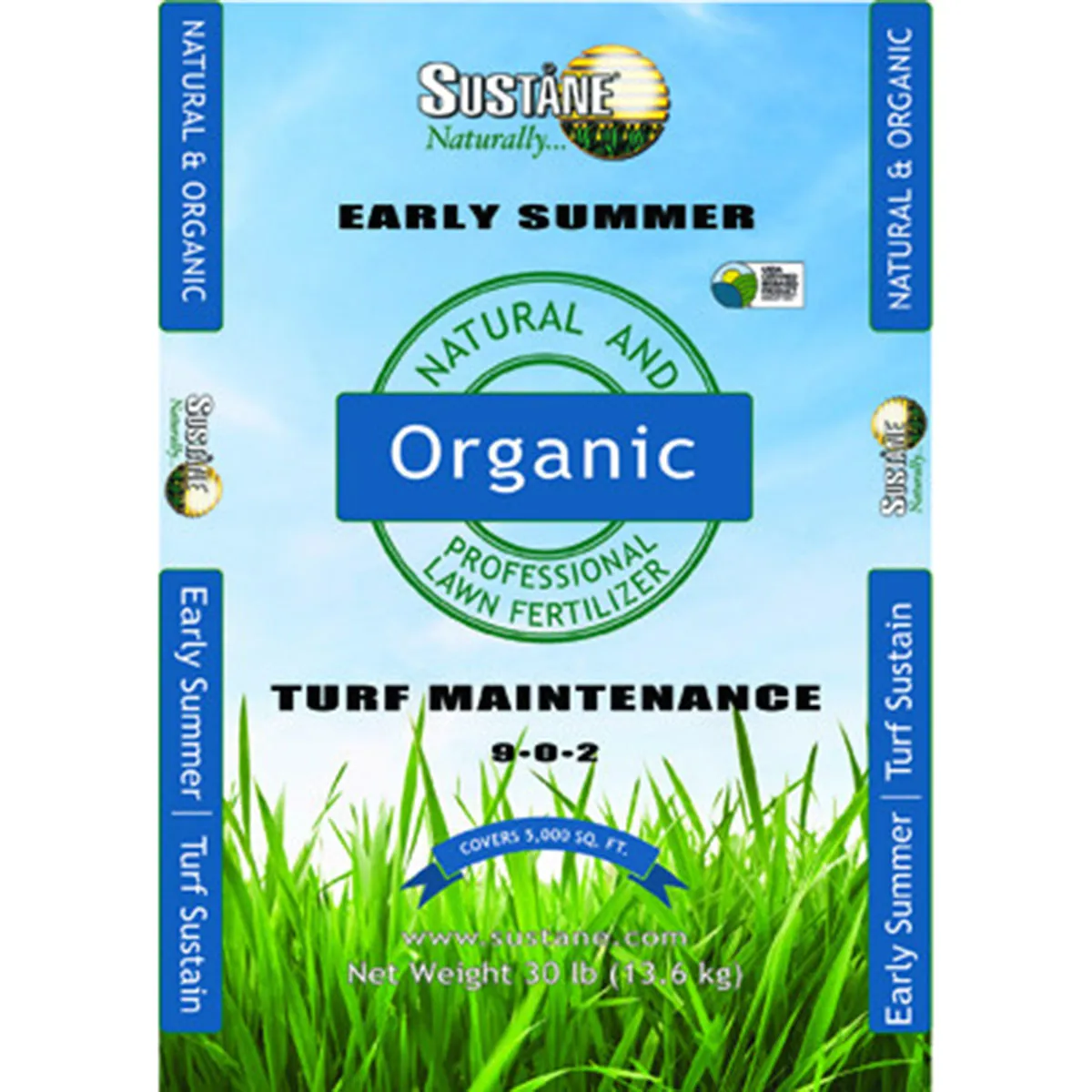 which helps promote thick lawns and lasting turf color - with quickly available natural Chilean nitrate for a fast turf response in cool soils. Sustane 9-0-2 also contains two types of high quality compost for improved soil building. Apply in May or June. 30 pounds covers up to 5000 ft2 Apply 6 pounds per 1000 ft2. Apply 10 lb per 1000 ft2 if grass clippings are removed or if the turf is heavily used or intensively managed.