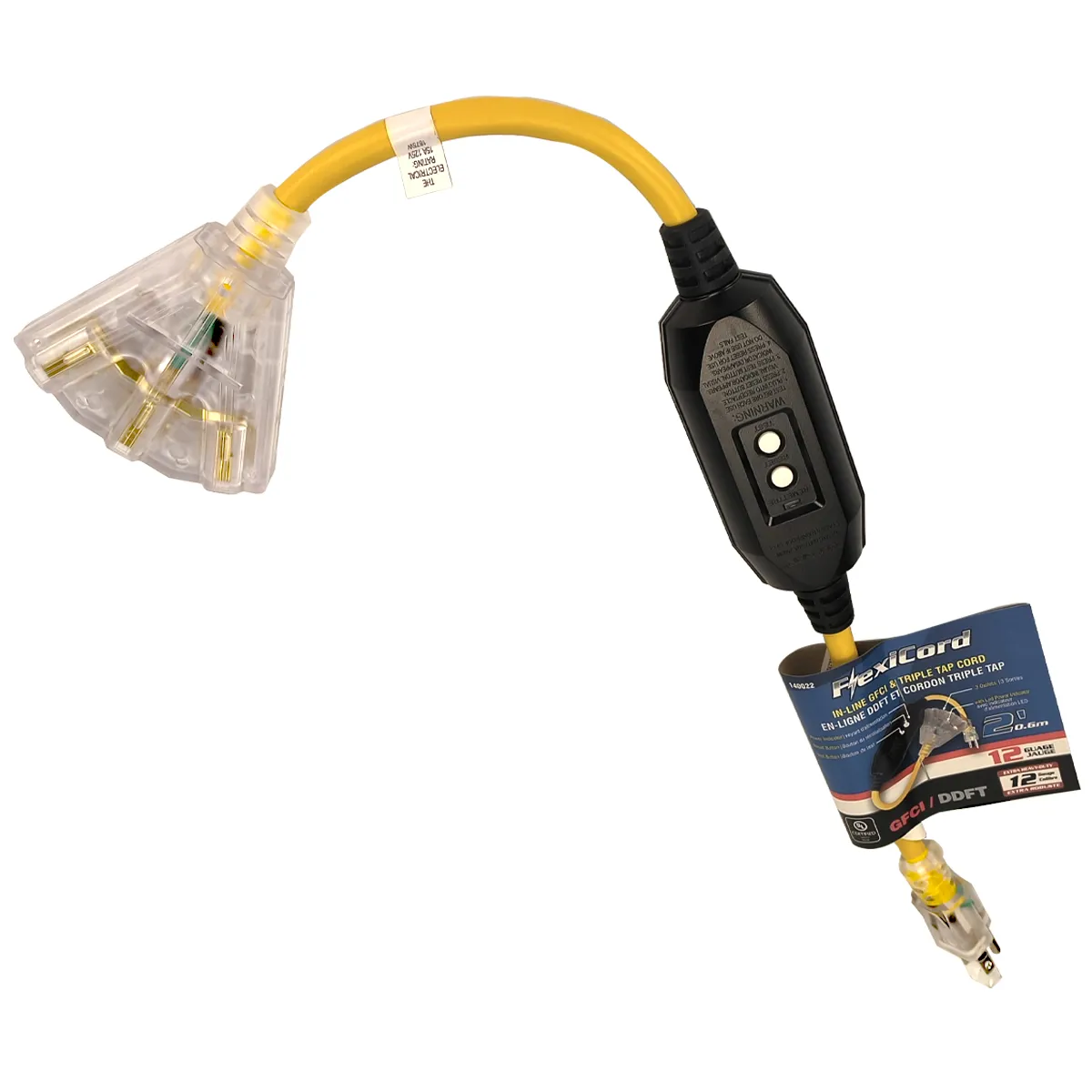 The FlexiCord In-Line GFCI and Triple Tap provides critical ground-fault protection for grounded appliances and power tools on any job site. Its durable PVC housing resists moisture, chemicals, and UV exposure, while the waterproof GFCI mechanism makes it safe for both indoor and outdoor applications. Integrated reset and test buttons, an LED power indicator, and a compact 2ft cord design ensure convenience and compliance in one unit. Rated 15A/125V/1875W with 12/3 AWG construction.