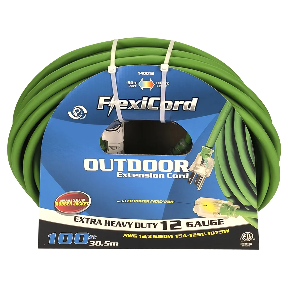 The FlexiCord Indoor/Outdoor 12 Gauge Extension Cord is built for tough jobs and extreme conditions, delivering reliable power when you need it most. Featuring a high-visibility green SJEOW rubber jacket, it resists elements like moisture and oil while remaining flexible in harsh environments. Lighted connector ends clearly indicate when power is active, allowing quick and easy monitoring from a distance. With a wide temperature range of -50°C to +105°C (-58°F to +221°F), this cord is ideal for job sites, workshops, and outdoor equipment use.