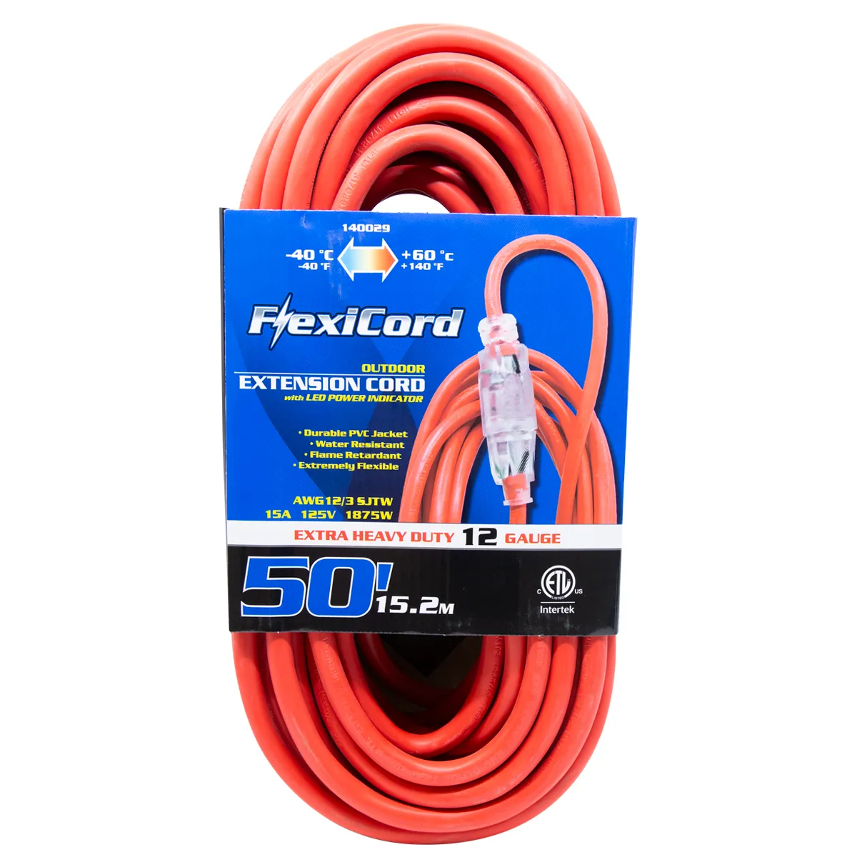 The FlexiCord Extra Heavy Duty 50ft Outdoor Extension Cord delivers powerful, flexible performance on demanding job sites. Its durable yellow PVC jacket is water-resistant and flame-retardant, staying extremely flexible from -40°C (-40°F) to +60°C (+140°F) regardless of conditions. The 12/3 SJTW construction and 15A/125V/1875W rating handle high-draw power tools without hesitation. LED power indicator and cETLus listing complete this professional-grade cord.