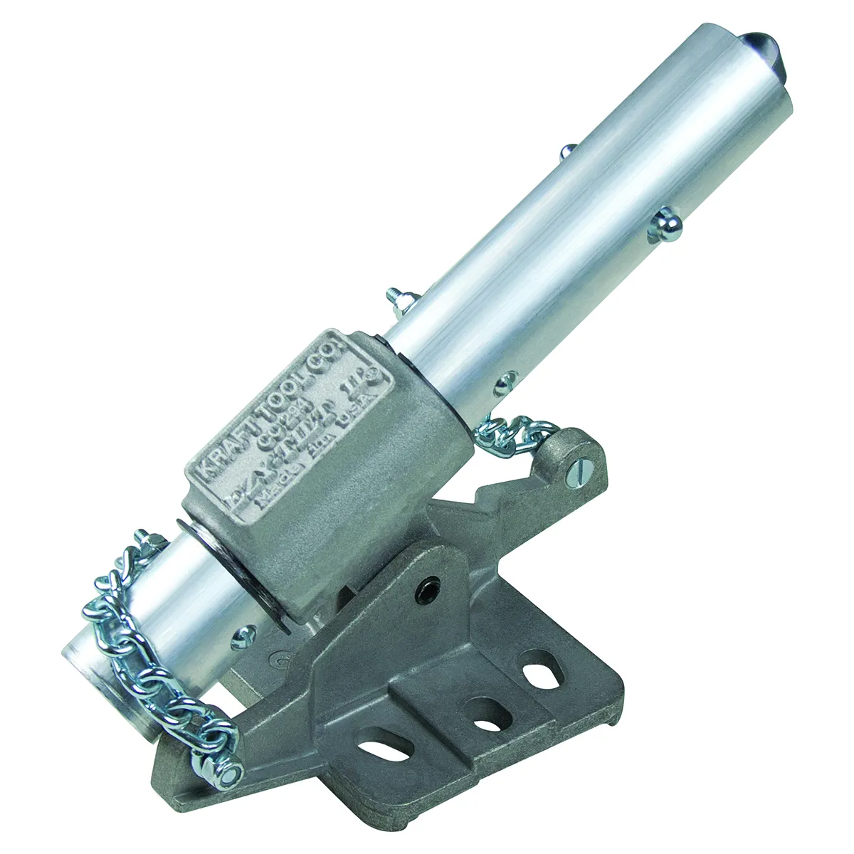 The EZY-Tilt® II double tilt action button float bracket attaches to fresnos or bull floats. The bracket is made of rugged; yet lightweight aluminum for durability. Control the pitch of the blade with a turn of the handle. Turning the handle eliminates the need for bending and lifting when moving tools across fresh concrete. Chain secures the bracket and eliminates over extension of the bracket. Use with 1-3/8in or 1-3/4in snap/button bull float brackets. Fits 2- or 4-hole bull floats.