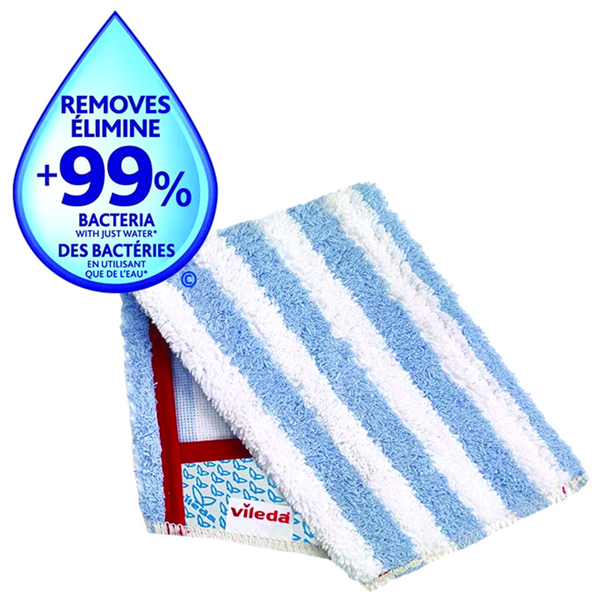 Multi-purpose microfibre and cotton mop head removes over 99% of bacteria with water.
