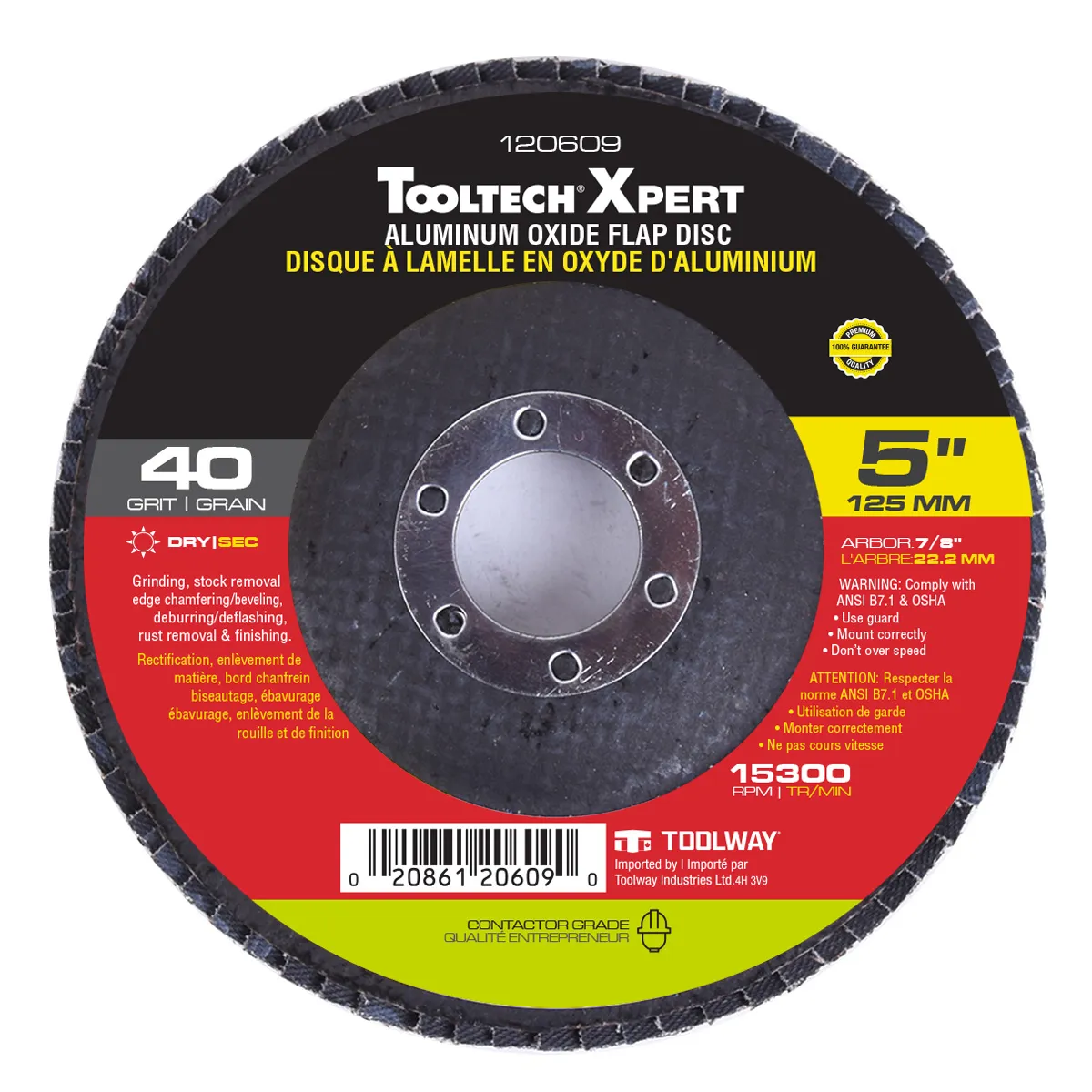 The Tooltech Workbench flap disc 40 grit 5in x 7/8in. Made of Alum Oxide.