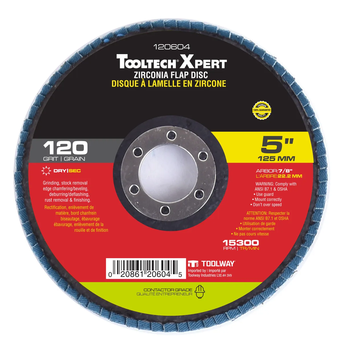 The Tooltech Workbench flap disc 120 grit 5in x 7/8in. Made of zirconia.