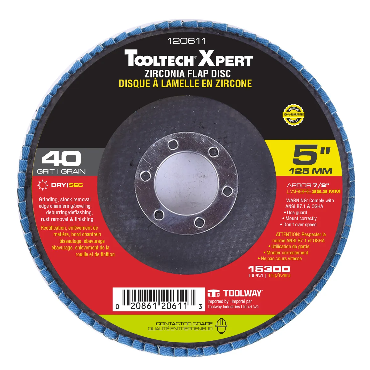 The Tooltech Workbench flap disc 40 grit 5in x 7/8in. Made of zirconia.