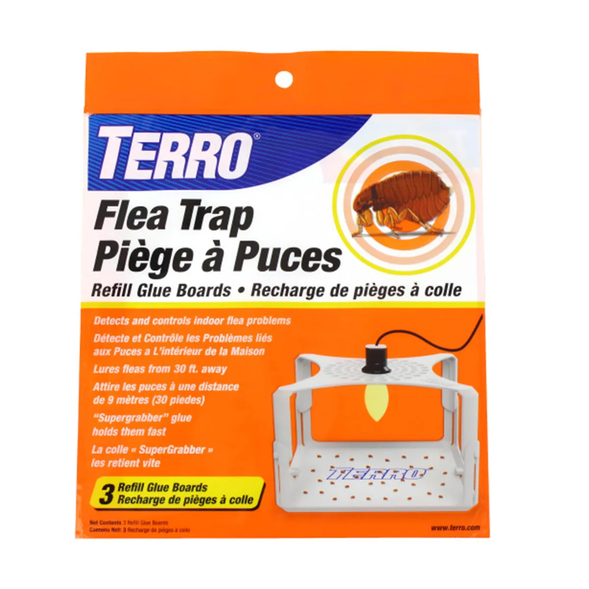 Monitor flea infestations year-round! TERRO Refill Glue Boards allow you to always have a fresh one on hand for your TERRO Flea Trap. Fleas leap into the trap where they get stuck fast on a SuperGrabber glue board. The glue boards will also capture other insects that attempt to cross its path. Put in a fresh glue board every two to four weeks, or when the glue board becomes full. To replace, simply insert a new glue board into the trap, glue side up. Then remove the release paper to expose the glue. Finally, dispose of the old glue board. This pack includes three glue board refills.