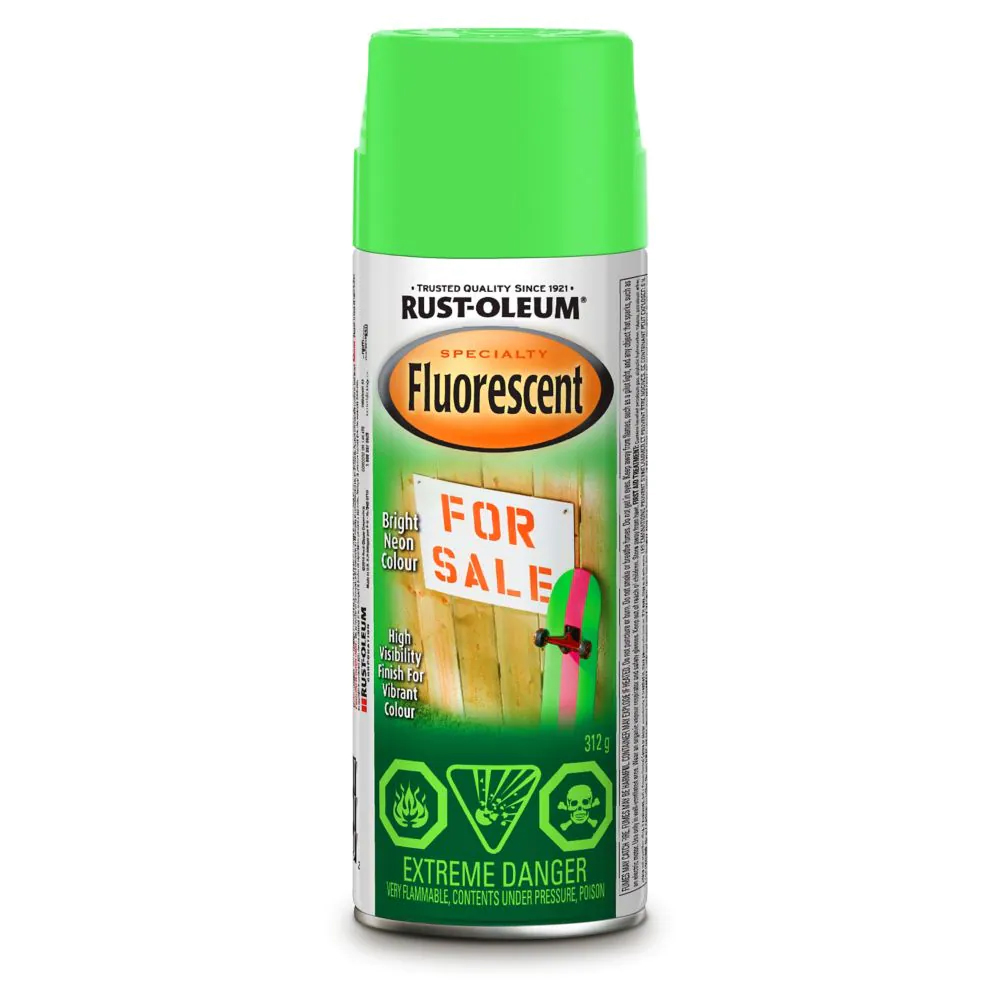 Rust-Oleum® Specialty Fluorescent Paint adds vibrant color to crafts; toys; sporting goods and more. Apply to any surface. Creates high visibility when stenciled or sprayed directly to objects.