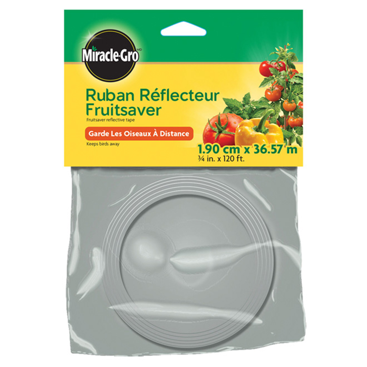 Miracle-Gro reflective tape to help keep birds away from the garden.