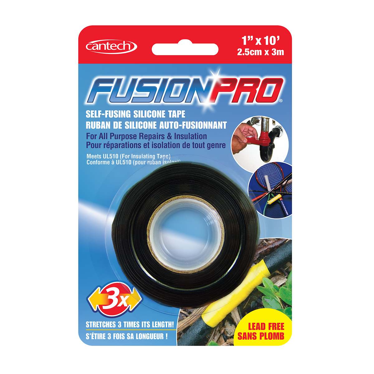 Fusion pro self-fusing black silicone tape fusion pro self-fusing black silicone tape is water retardant for auto repair; electrical wiring; watercraft; plumbing and general repair sticks to itself and fuses in under 24 hours - even under water temperature resistance from -54 deg c to 260 deg c (-65. 2 deg f to 500 deg f) withstands salt water; fuel; acids and prevents corrosion stretches to 3x it's length and adds tension to tight seals clean removal with no adhesive residue tape dimensions: 1 inch w x 9. 8 ft l (25 mm x 3 m).