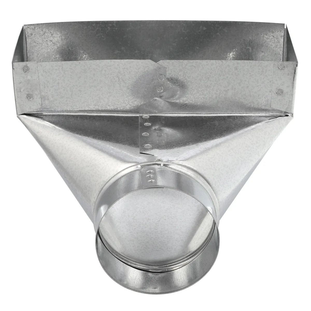 Used for right-angle transition from round pipe or insulated flexible duct to a register or grille.