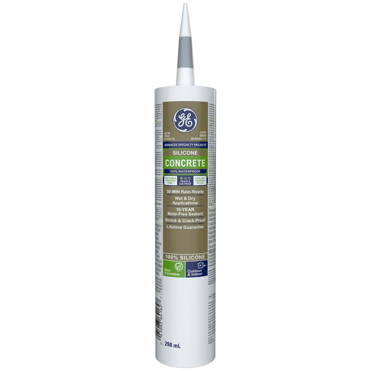Concrete Silicone 2 sealant is a high-performance; 100% silicone and 100% waterproof sealant ideal for concrete; mortar and stone projects. This 30-minute rain-ready formula is light gray in color and offers permanent flexibility and excellent durability with 10-year mold-free product protection to help resist mold and mildew growth. Backed by a lifetime guarantee. Adheres to: brick; stone; stucco; masonry; asphalt; concrete; cement; most metals & woods; aluminum; composites; cement board; glass; ceramic & porcelain tile; drywall; plaster; vinyl siding; PVC; fiberglass & painted surfaces. For additional information; see product label.