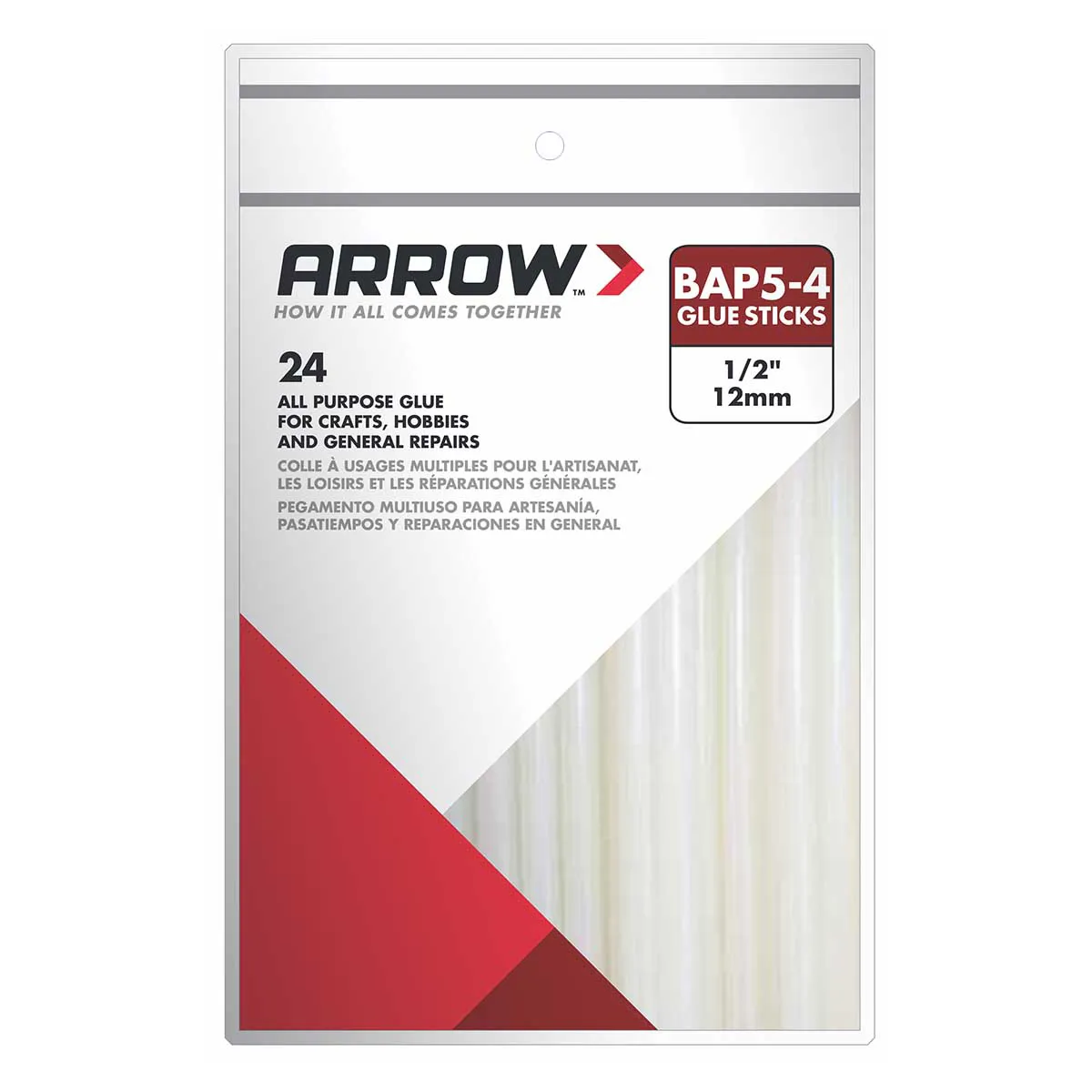 Glue sticks all purpose hot melt clear size 1/2in by 4in length bulk pak pack of 24 for crafts; hobbies and general repairs. For woodworking; canvas; cardboard; ceramics; fabrics; leather; metal; plastics; etc. Press surfaces together for 15 seconds. Sets in 30 to 60 seconds. 4in sticks break to 2in for thumb feed models. For use in all 1/2in Arrow glue guns and other standard sized glue guns.