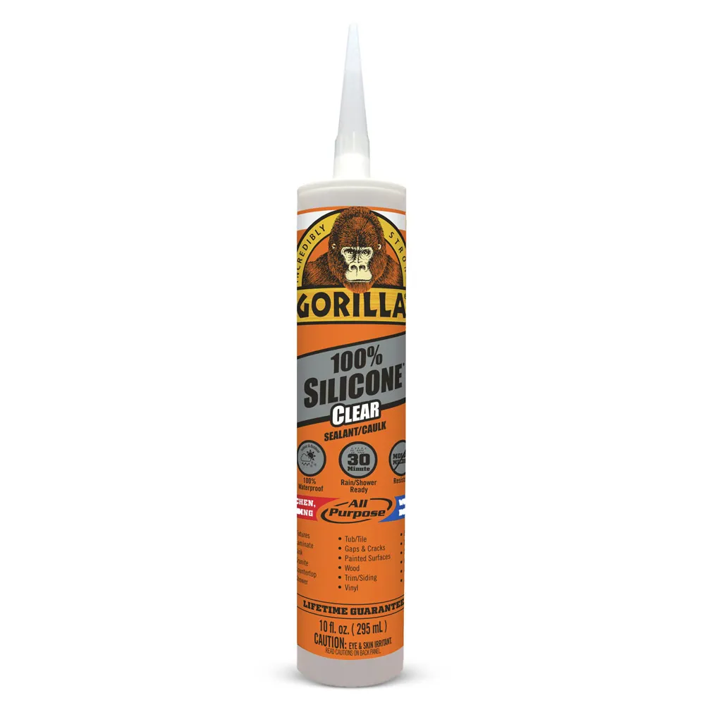 Gorilla 100% silicone sealant is great for kitchen; bath; window; doors; auto; marine plumbing; gutters and more! Ready for water exposure in just 30 minutes; this waterproof sealant is mold & mildew resistant. The clear silicone sealant won't yellow; shrink or crack over time!.