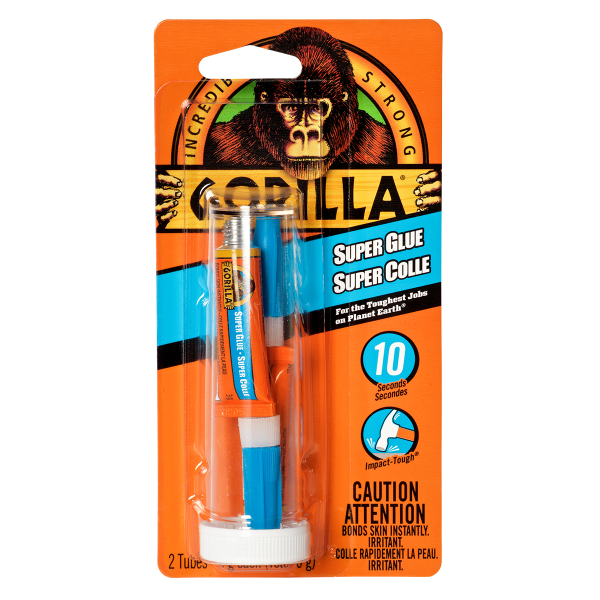 Its high strength and quick set time make Gorilla super glue the go-to adhesive for a variety of household projects. Developed for long-lasting repairs in an instant; the clear glue dries in 10-45 seconds. Our super glue is reinforced for increased impact resistance to handle bumps and drops. We call it Impact-Tough® because the reliable bond stands up to wear and tear. super glue; also referred to as cyanoacrylate glue; or CA glue; works on a variety of materials; including plastic; metal; stone; ceramic; paper; rubber and more. In addition to Gorilla super Glue's high-performance cyanoacrylate formula; we've added an anti-clog cap with a metal pin inside ensuring an airtight seal for maximum reusability. It's Gorilla tough; every time.