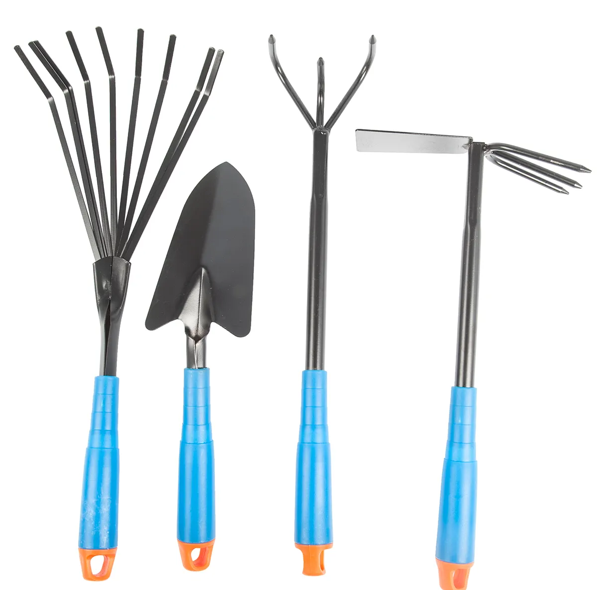 • 4-piece gardening tool set hand trowel hoe and cultivator hand tiller hand cultivator hand rake.