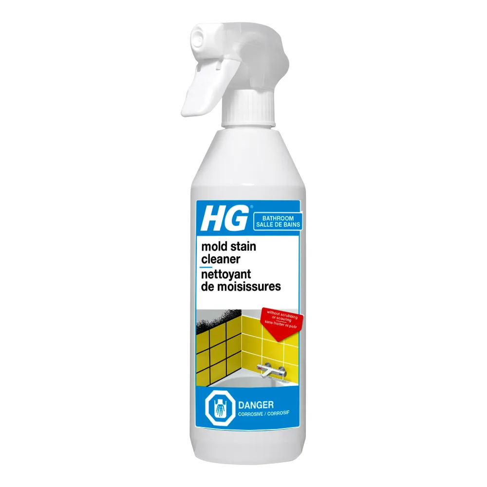 HG mold and mildew remover immediately removes mold; mildew; algae; fungus and moss; found in humid and wet areas. HG mold and mildew remover can be used to remove molds etc.; from grouting in between wall and floor tiles (also suitable for marble); silicone and rubber seals; plaster and drywalled walls and ceilings. HG mold and mildew remover will remove molds from bathrooms; showers; utility rooms; cellars; garages; saunas and around swimming pools. Also for fungus; moss and algae growth on balconies; walkways; terra cotta pots and garden ornaments. Directions for use: Ventilate well during use and wear rubber/plastic gloves. Remove the locking clip before use. The product has a bleaching effect; so in case of doubt start by testing it in an unobtrusive place. Apply directly to mold and algae but scrape away layers of fungus and moss before use. Press the nozzle at the front side and turn a quarter. Spray the surface from a distance of approx. 3 -5 cm. (2 inches). Flexible silicon seals and surfaces that are badly stained should be sprayed again after 30 minutes and the product left to work for 30 minutes. When clean; rinse the treated area with plenty of water and a sponge. Turn the nozzle a quarter backwards after use (blocking position). Do not use near plants or fabrics. Cover untreated metal and high gloss paintwork. Prevent splashes on clothing; paintwork and vertical blinds. Before using HG mold and mildew remover we recommend to test first on a small inconspicuous area. Avoid eye contact; rinse immediately with water. Some coloured silicone joints might show slight discoloration after use of HG mold and mildew remover. In some cases a slight brown stain may appear after use on older tubs and crazed (hairline crack) tiled surfaces. This can be removed with Hypo (sodium thiosulphate).