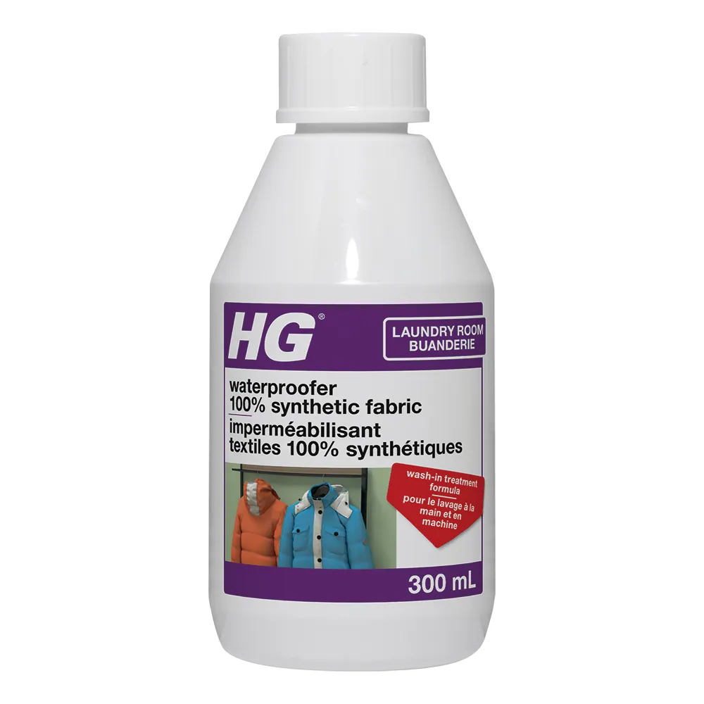 HG 100% synthetic fabric water proofer has been developed to make polyamide; polyester; nylon and other 100% synthetic fabrics water-repellent and dirt-repellent. This highly concentrated product can be used to make snowsuits; rain clothes; and patio furniture covers water repellent and-dirt repellent. Directions for the hand-wash method: The garment to be treated must be clean and dry. Fill a bucket or sink with approximately 6 litres of lukewarm water. Add 100 ml of the product for every kilo of laundry. Submerge the garment in the solution and turn it regularly for 15 minutes. Rinse with cold water. The effect of this product is enhanced by heat. Therefore iron the fabric before it is fully dry or dry it in a tumble-drier r hang on wash line.