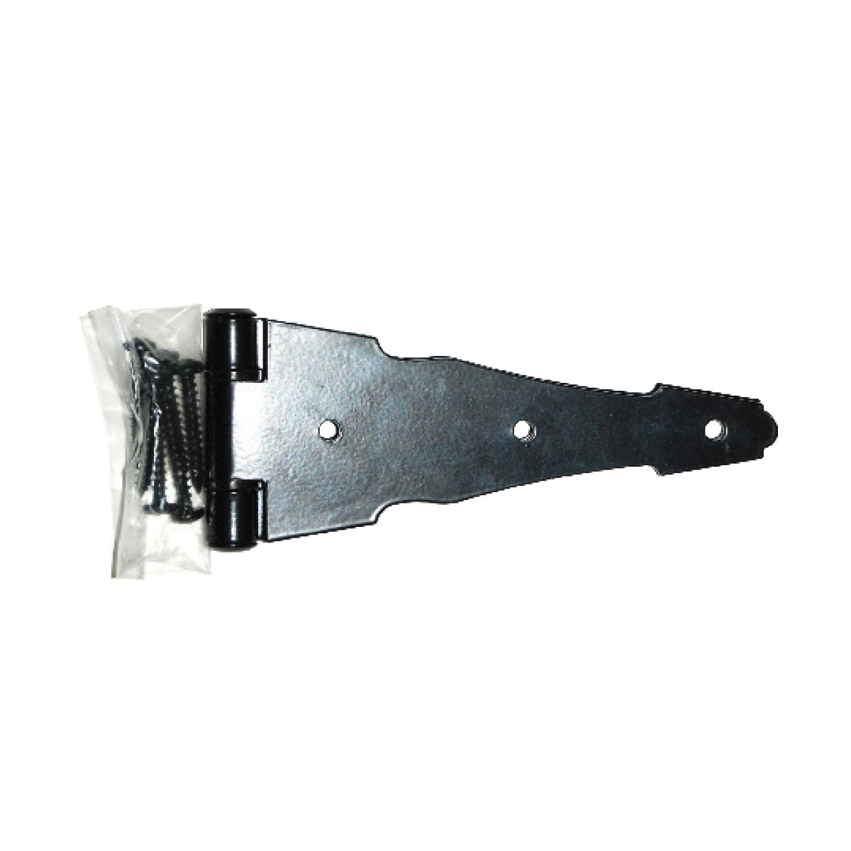 Square holes on strap hinge permits use of carriage bolts or lag bolts on installation.