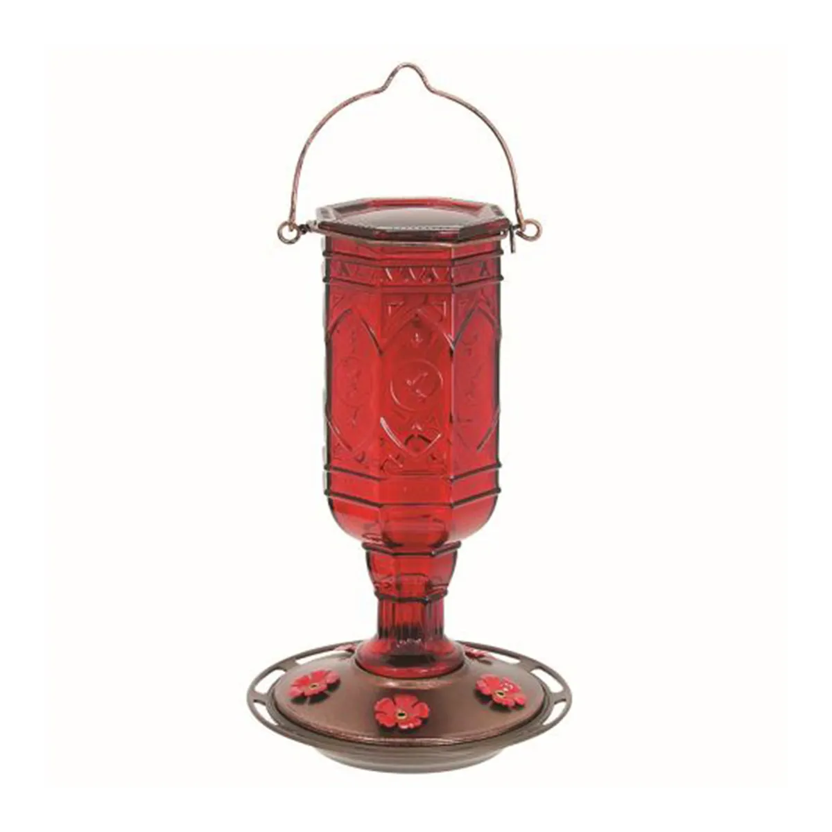 Hummingbirds are nature’s gems; so attract more hummingbirds to bedeck your backyard with a More Birds® Red Jewel Hummingbird Feeder! This stunningly red; vintage 8-sided glass bottle design features elegant hummingbird motifs that add a splash of bygone beauty to your backyard. With polished copper accents; the Red Jewel is built with a durable metal basin cap that includes 5 metal flower feeding ports in polished red. The wide opening and flat bottle make it easy to fill; and the feeder disassembles into three pieces for convenient cleaning. The Red Jewel features a metal perch ring that provides hummingbirds a place to rest while feeding. A built-in hanger is included for easy hanging. With a 20 oz. nectar capacity; the Red Jewel provides plenty of nectar to keep hummingbirds happy and coming back for more!