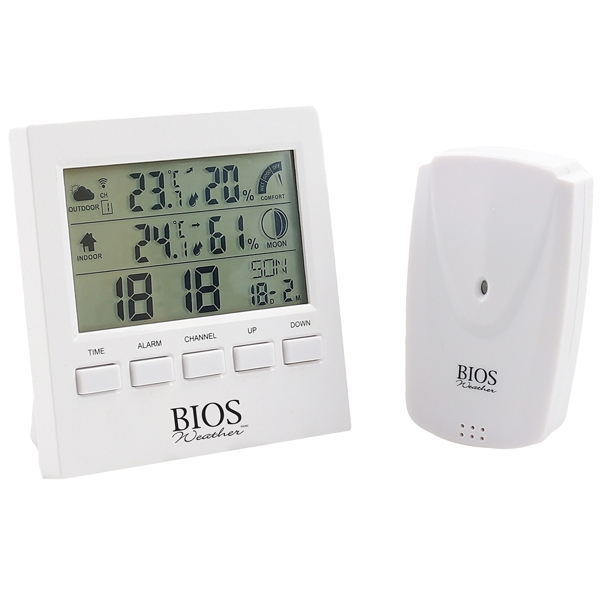 Stay informed about your environment with this versatile indoor/outdoor thermometer; designed for home use. Featuring a clear display and user-friendly touch controls on the front panel; this device provides real-time temperature and humidity readings. Monitor both indoor and outdoor conditions with precision; and easily track daily extremes with min/max memory functions. Additional features include moon phase display; a low battery indicator for both the main station and outdoor sensor; and compact desktop design that fits any room. Batteries are not included. Power Requirements: Station – 2 x AAA | Sensor – 2 x AAA Outdoor -40°C /-40°F to 70°C /158°F.