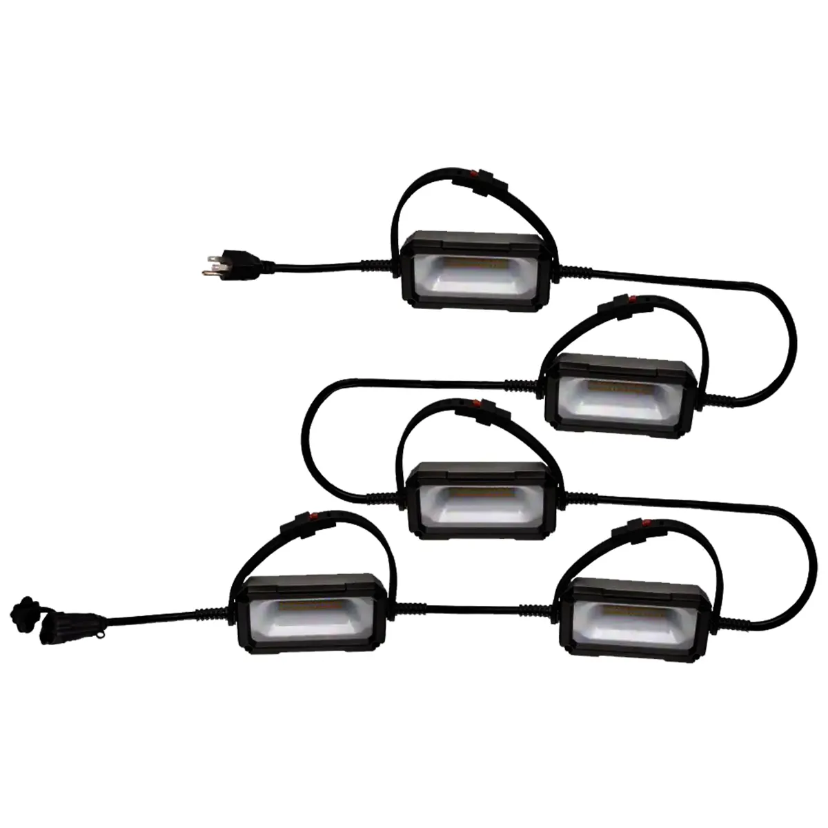 LightWay® Industrial LED Worklight String Light comes with 5 heavy duty aluminum head casing; featuring 2000 lumens each head for a total of 10.000 lumens; and 5000K color temperature. 50ft long SJTW 16/3 AWG cord with female receptacle for linking up to 10 sets together. Can be used indoors and outdoors in wet areas as is rated IP54.