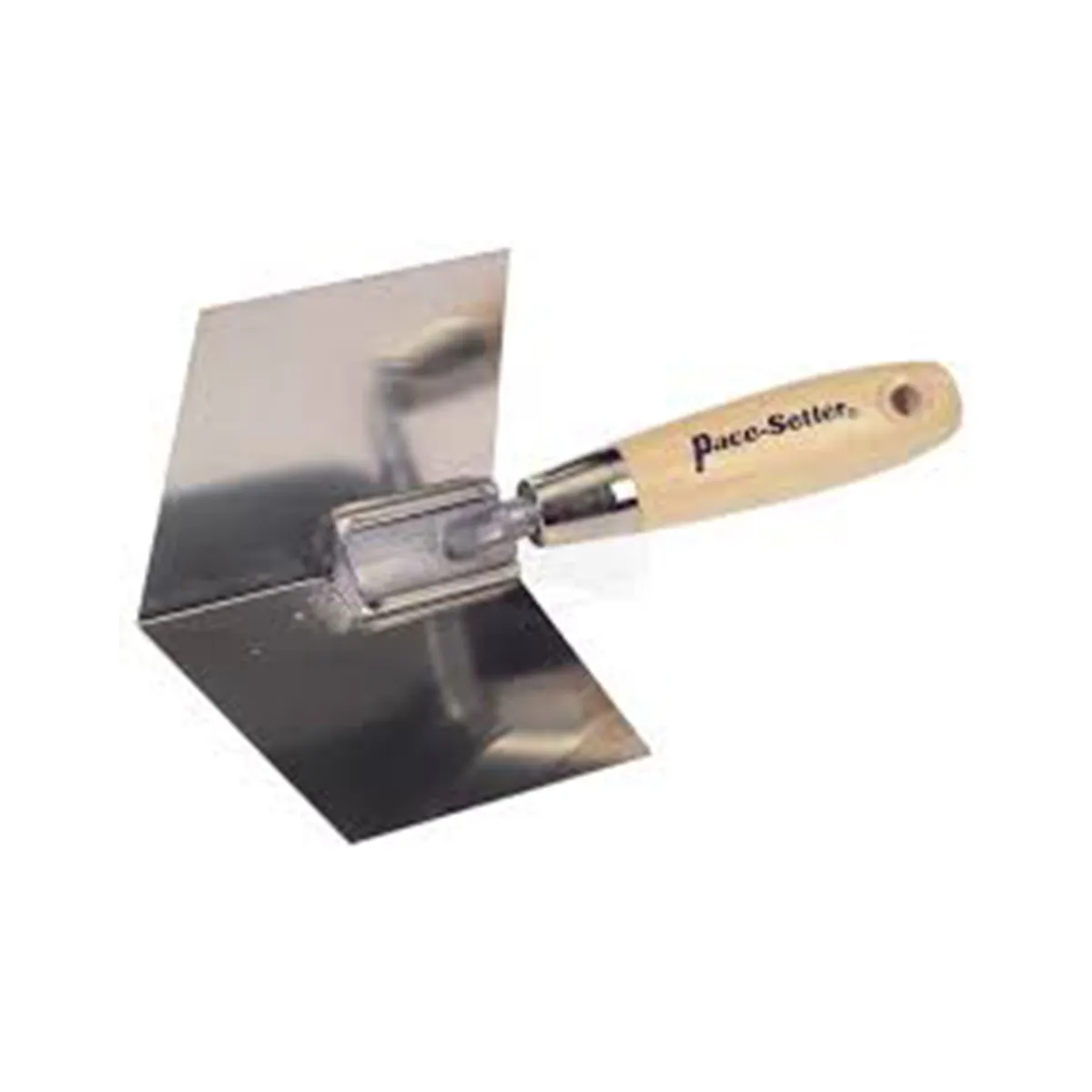 Inside corner tool with wood handle. Stainless steel blade. For finishing drywall that applies joint compound to both sides of a corner at the same time.