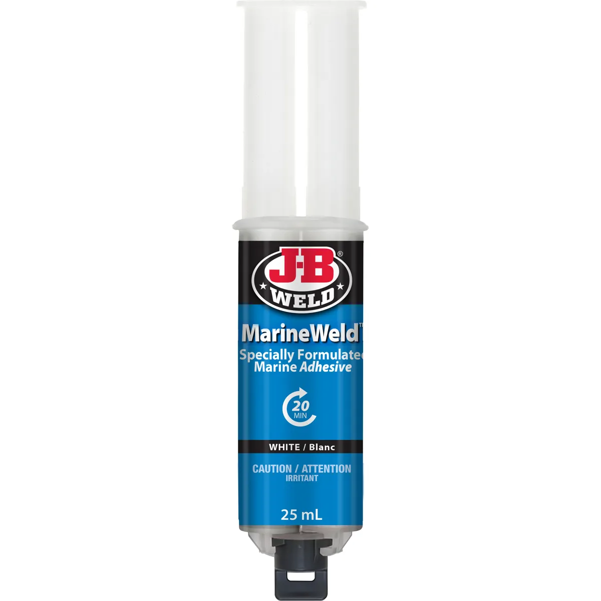 MarineWeld™ is a specially formulated two part Cold-Weld™ adhesive system that provides strong; lasting repairs for bonding different or similar surfaces; such as metal; composites; fiberglass and others. MarineWeld™ has a 1:1 mixing ratio that sets in 5 minutes at room temperature; and cures in an hour to a white color. It may then be shaped; tapped; filed; sanded and drilled; retaining full strength above or below the waters' surface. MarineWeld™ has a tensile strength of 2350 PSI.