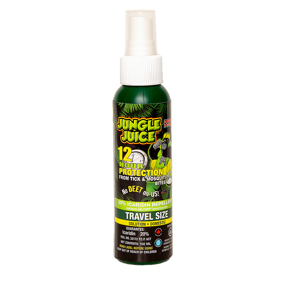 Deet free-20% icaridin; can be taken in carry on luggae when flying; 12 hour protection from moquitoes & ticks 10 hr protection from black flies; for use on the whole family-babies from 6 months and up!