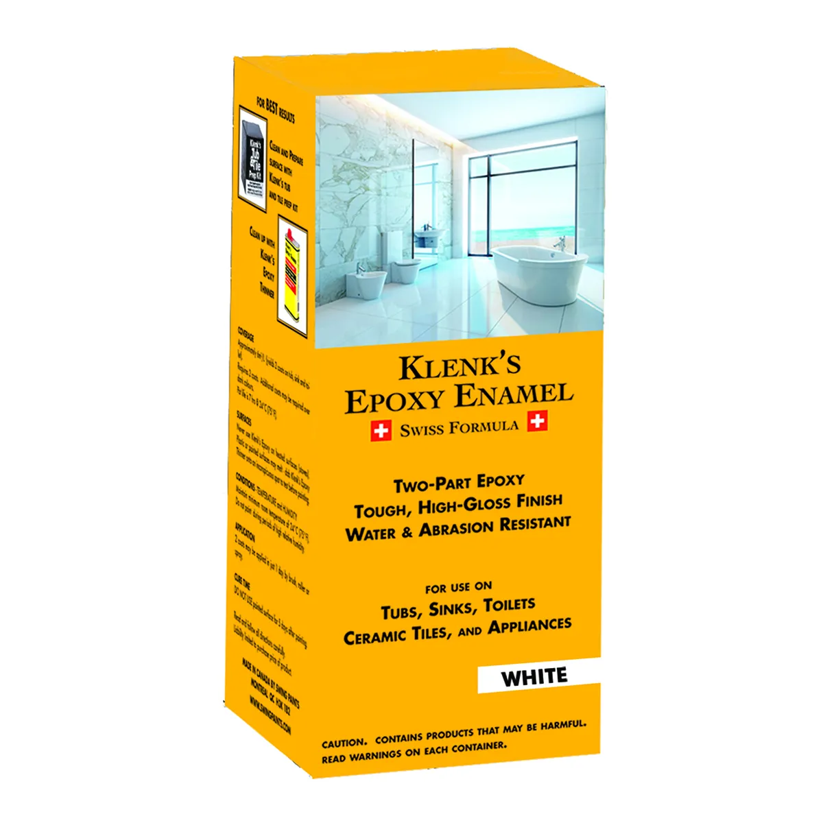 Klenk's epoxy enamel is an extremely hard and durable two-component epoxy for consumer and professional use. It is specially designed to restore the finish on tubs; sinks; toilets; ceramic wall tiles and appliances. Klenk's epoxy enamel can be used on any hard; solvent-resistant surface; such as ceramic; metal; stone; marble; melamine and fiberglass. Do not use on plastic or imitation marble; stove top ranges; or other surfaces subject to excessive heat. Always test surface with Klenk's epoxy thinner prior to use.