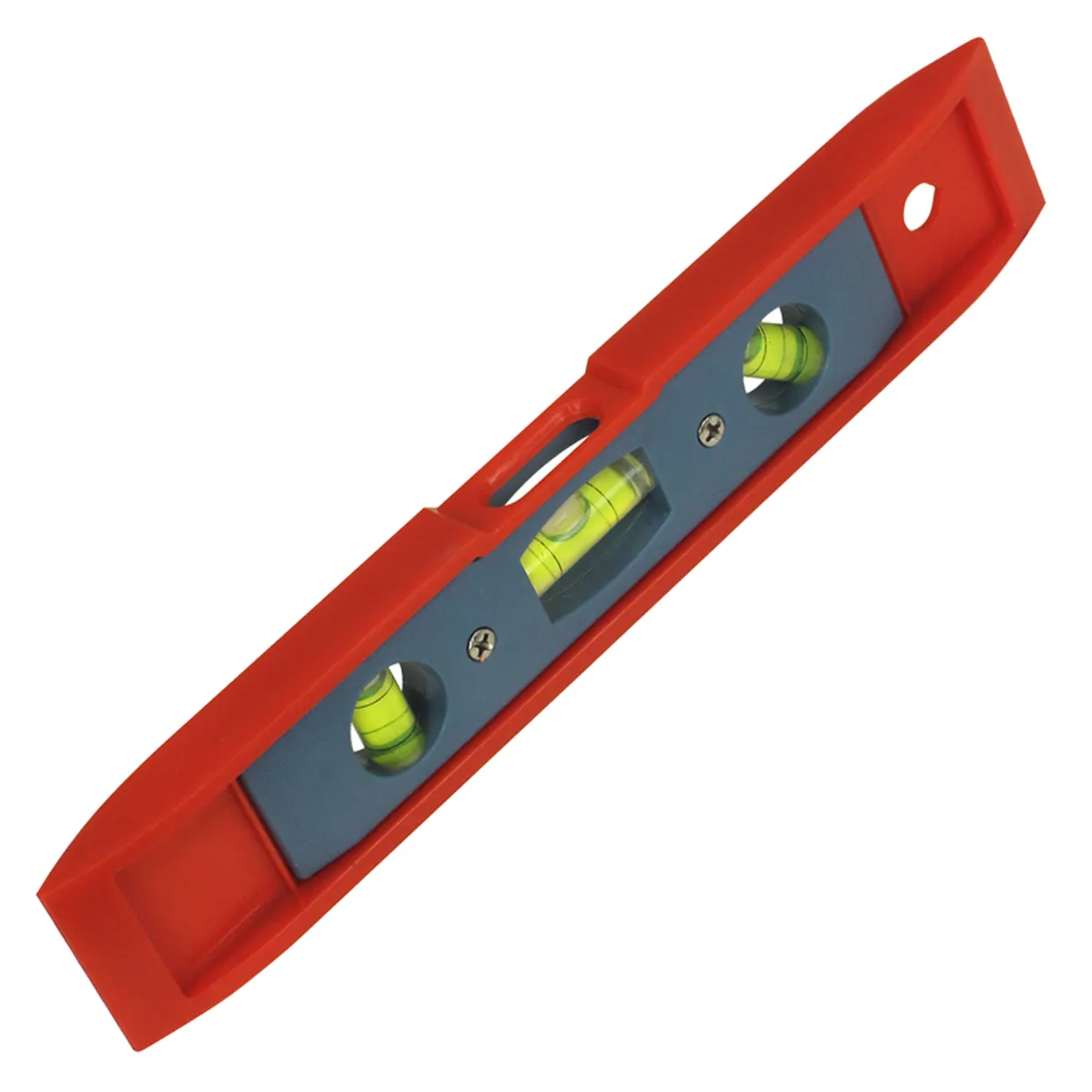Lightweight plastic frame makes this level handy for everyday projects around the house. This versatile level has three easy-to-read vials. The vials are positioned for top-reading; plumb and 45-degree leveling. Magnetic bottom expands the versatility; also great for use with metal studs. Slim design is easy to handle. Hang hole can be used for toggling or to hang for easy storage when not in use. Colorful design.