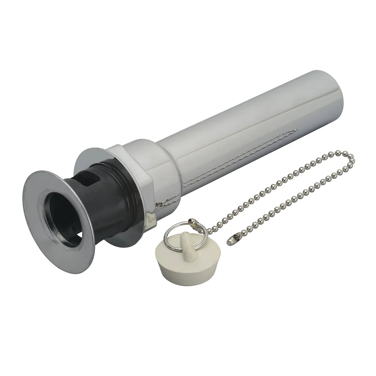 One piece; with stopper and chain; chrome-plated plastic top and vacuum plated base.