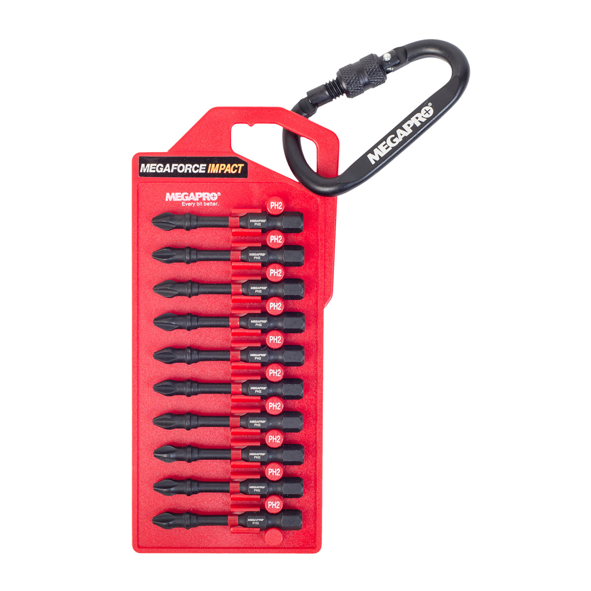 Megapro’s Industrial-grade MegaFORCE Impact bits are made from specially modified S2 Steel to absorb high impact shock and provide maximum durability and performance. Bits are 2in long and coated in black oxide for corrosion protection. Each bit size is color-coded for easy-to-find selection and the pack comes with a carabiner clip that can be quickly attached to your toolbox or belt. This set includes ten #2 Phillips Impact Bits.